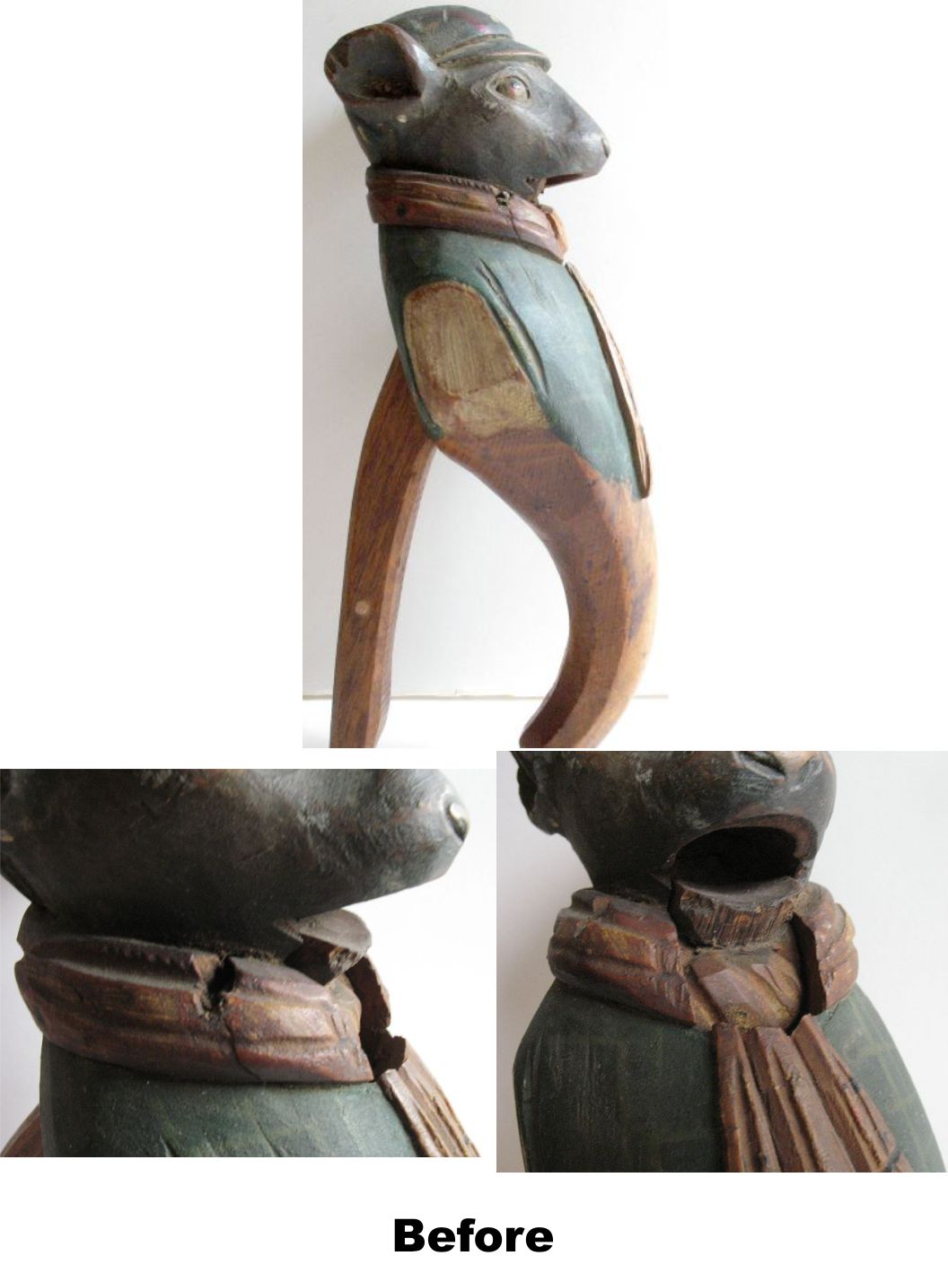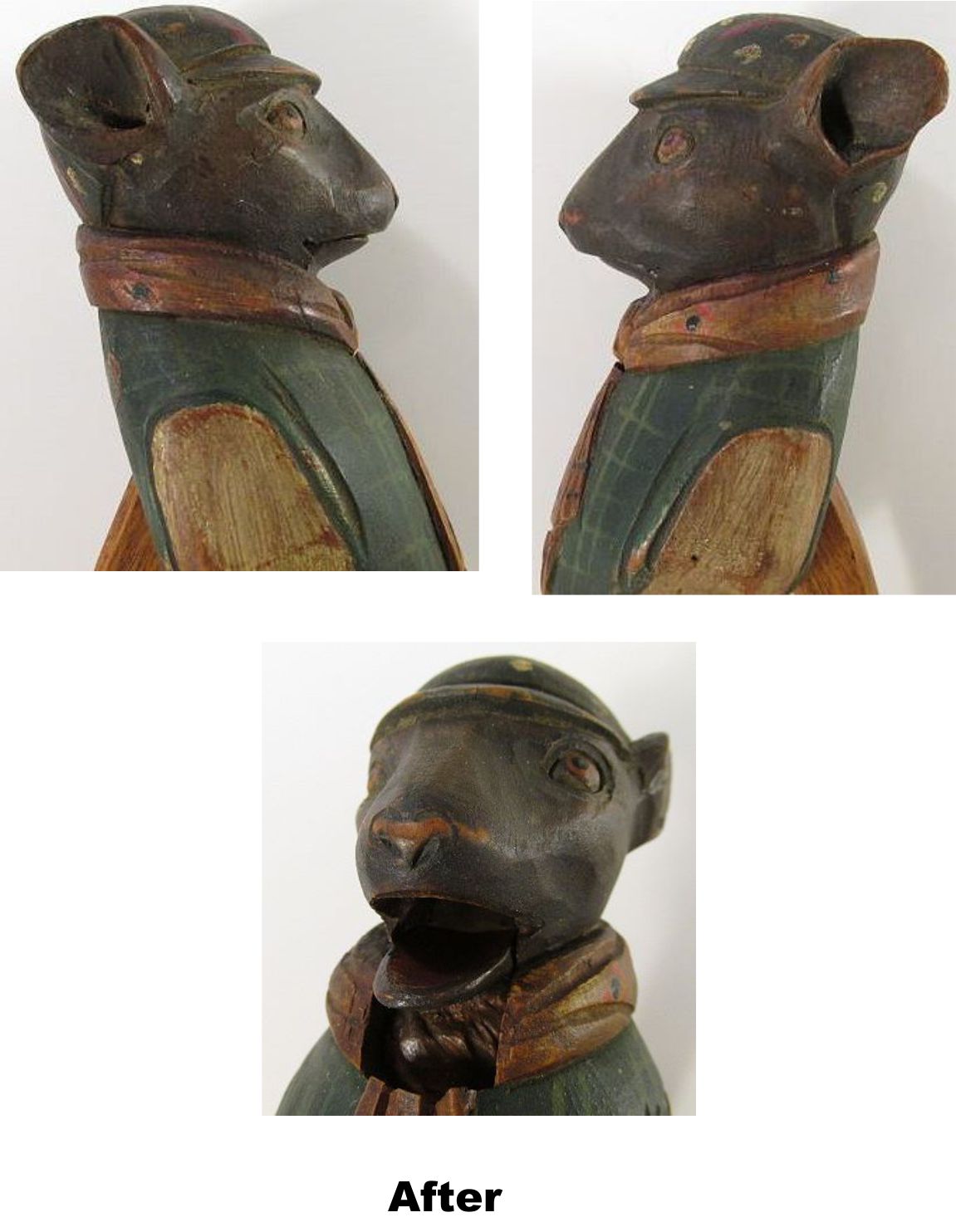 Mar 18Here’s another great piece from Arlene and the Leavenworth Nutcracker Museum. This ANRI Mouse came in with its bottom jaw missing . This is usually caused by people’s misconception that the nut gets cracked in the mouth rather than in the back in the space provided under the lever. I see a lot of pieces with this type of damage. He also had a chip out of its right ear and the pin needed replaced.