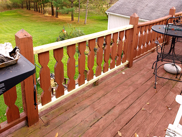 The deck railing’s bottom board split and a baluster had come out. This made the rest of them loose which left this section of railing very unsafe.