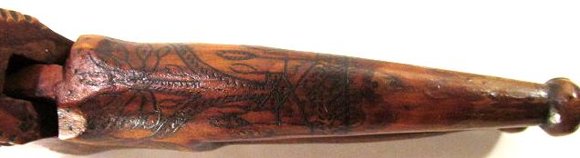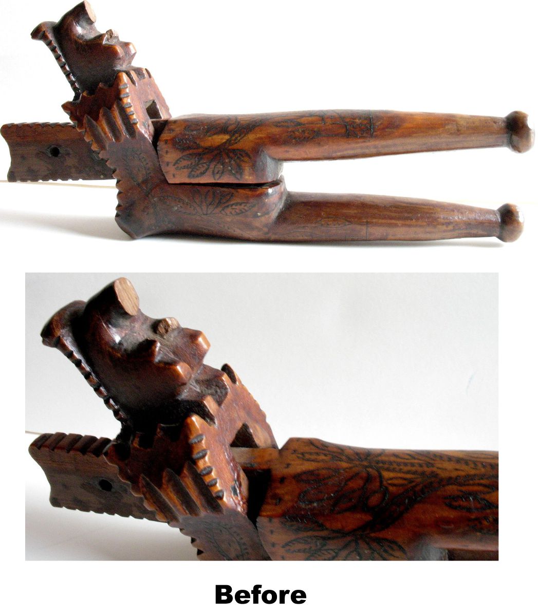 This nice little Squirrel Nutcracker features an adjustable lever and finely detailed markings all over. It was missing its head and the pin was varnished solid in place removing the ability to adjust it. I restored the piece’s functionality, gave this little guy a new head, and took the liberty to add a nut to the design. It’s the least I could do for this little guy after all he’s been through.